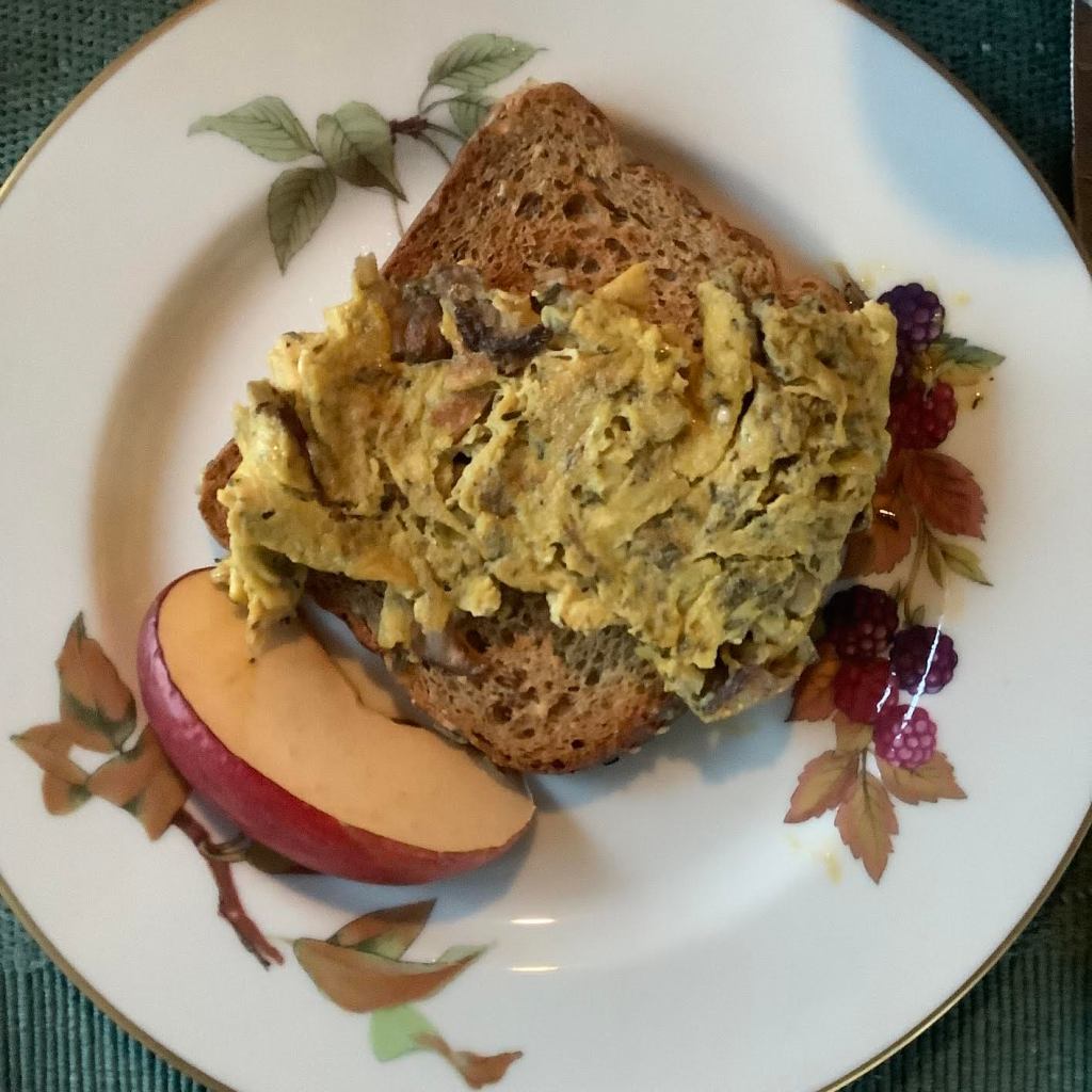 1 piece 70-cal multi-grain bread ++++ one 2-oz egg ++++ ½ oz mushrooms, chopped ++++ 1 Tbsp chives, chopped ++++ 1 tsp thyme ++++ 1 oz apple ++++ Optional: blackish coffee [53 calories] or blackish tea or mocha cafe au lait [65 calories] ++++ Optional: 5-6 oz fruit smoothie or berry-yogurt smoothie [88 calories]