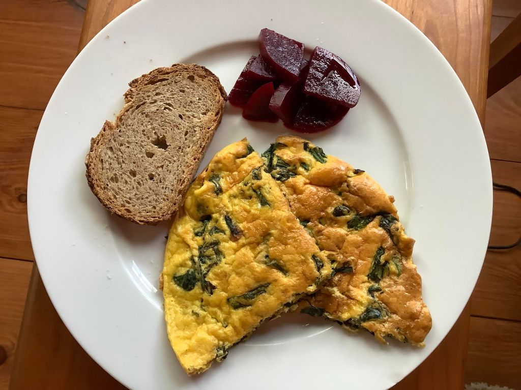 When Dorothy leaves her ruined farmhouse to go explore Munchkin Land, she fills her basket with food from the kitchen. Bread, apples, and cheese are fine foods for the road. Our breakfast is made of apples and cheese. Dinner shows what you can do with sandwich bread on a Fast Day.