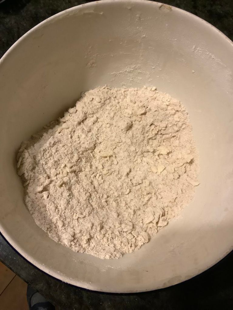 | 1 2/3 c white flour 2 tsp salt ½ tsp mace or nutmeg 4-5 c white whole wheat flour | ½ + 1/3 c white flour 1 tsp salt ¼ tsp mace or nutmeg 2-2½ c white whole wheat flour | Combine in a large bowl. |