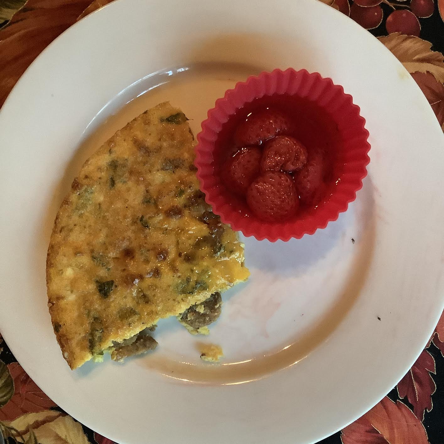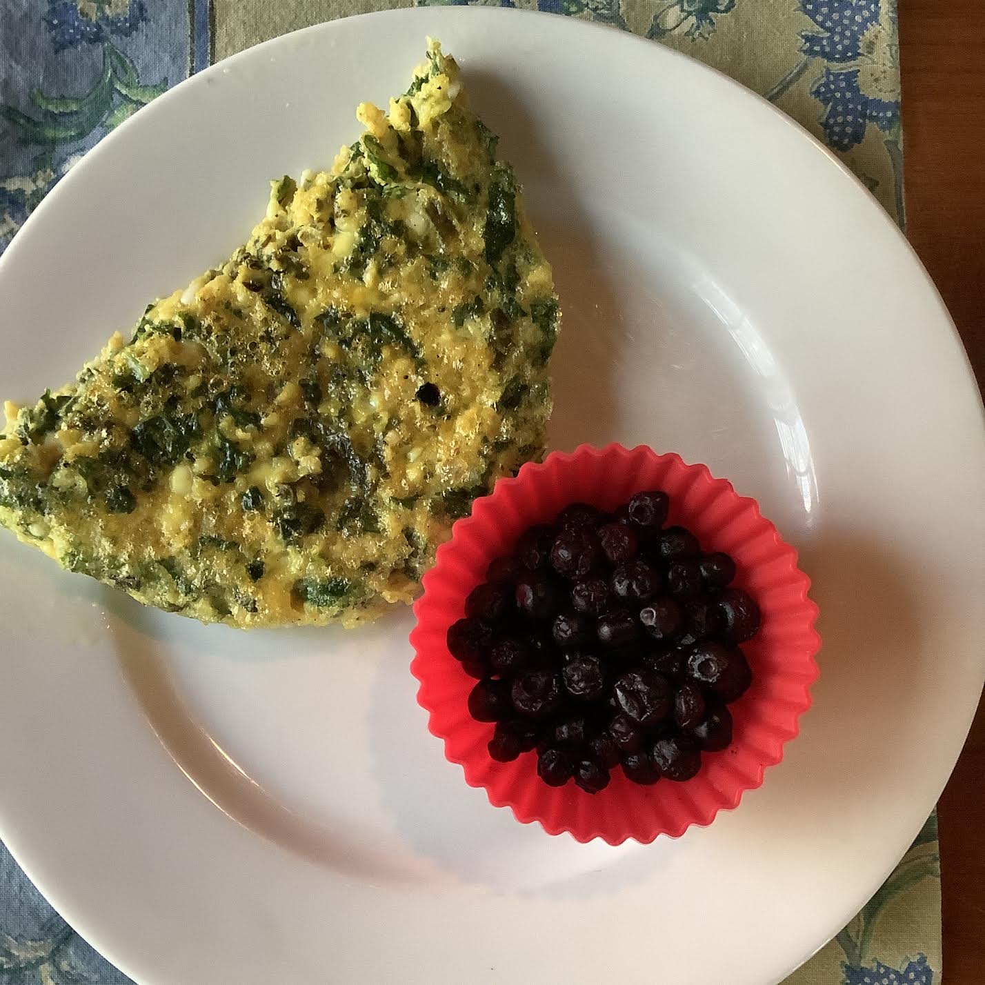 ++ 1½ two-oz eggs HINT: If you are serving one person, crack three 2-oz eggs into a small bowl or glass measuring cup. Whip up those eggs and pour half of their volume, crack three 2-oz eggs into a jar with a lid and put it in the ‘fridge for next week. ++++ 1 oz bell pepper, steamed and diced ++++ 1½ black olive, pitted and chopped ++++ 1/8 oz [by weight] goat cheese/chevre], diced/crumbled ++++ 2 oz plum OR strawberries ++++ Optional: blackish coffee [53 calories] or blackish tea or mocha cafe au lait [65 calories] ++++ Optional: 5 oz fruit smoothie or berry-yogurt smoothie [88 calories] ++