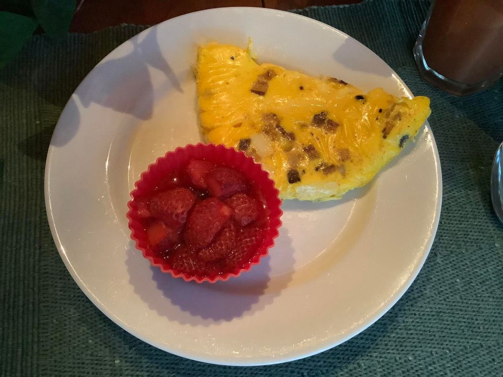 ++ 1 two-oz egg ++++ ½ slice uncured bacon ++++ 3 Tbsp whole milk ++++ ½ oz Swiss cheese [Emmenthaler, Gruyere] ++++ pinch cayenne pepper ++ pinch nutmeg ++++ 2 oz strawberries ++++ Optional: blackish coffee [53 calories] or blackish tea or mocha cafe au lait[65 calories] ++