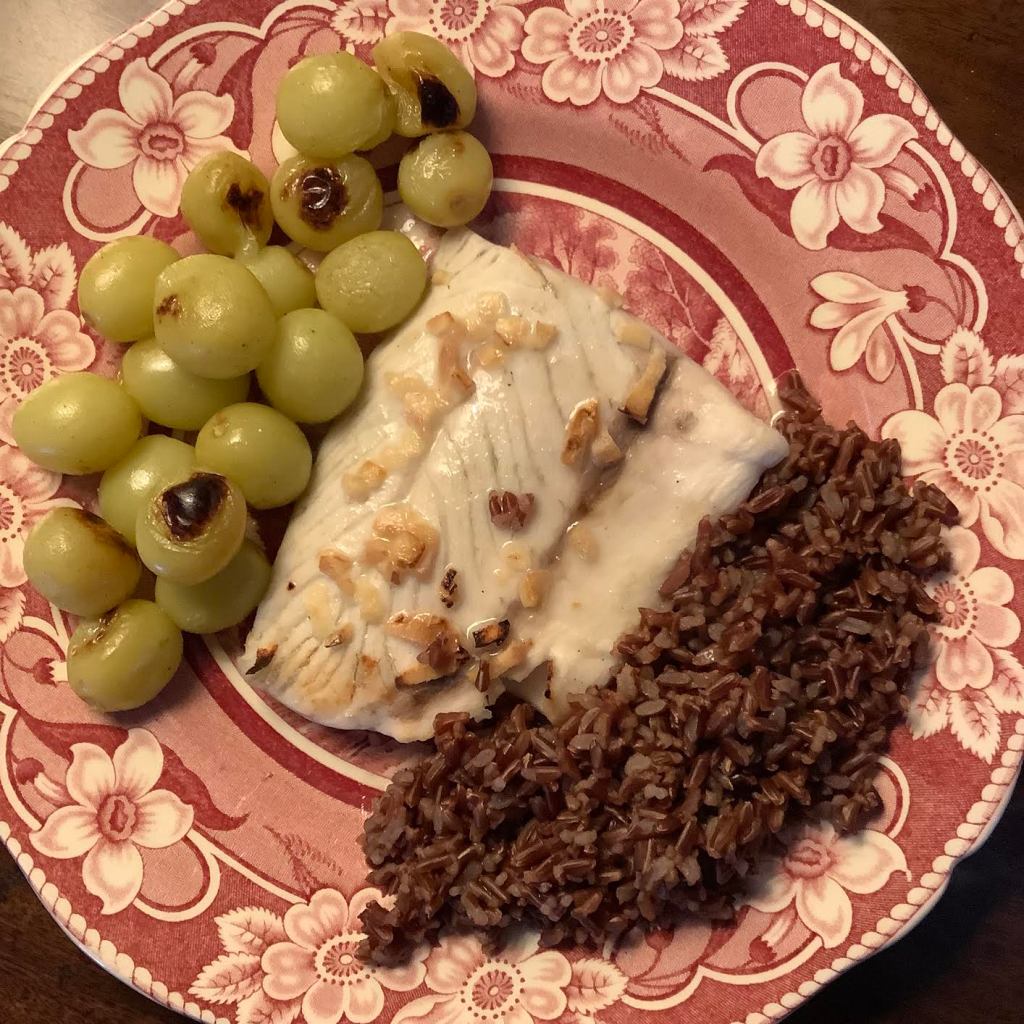 Broiled Fish w/ Grapes: with potatoes: 216 calories… 1 g fat… 2 g fiber… 23.5 g protein… 32 g carbs… 53 mg Calcium… –OR– with Camargue rice: 279 calories… 2 g fat… 2.5 g fiber… 24 g protein… 45.4 g carbs… 53 mg Calcium… PB GF Enzo MacLeod, Peter May’s Scottish-expat forensic expert who lives in France, prepared this meal for a family dinner at home. For a side dish, Enzo serves boiled potatoes, but you could substitute Camargue red rice.