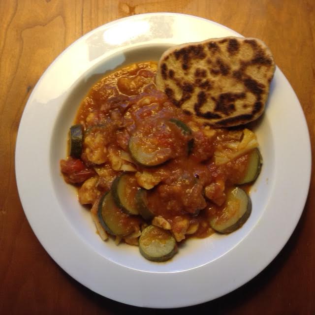 First, boil the brown rice or lentils. HINT: Check the package for cooking time and plan ahead. Boil extra and freeze the remainder for next time you have this meal. Steam or boil the carrots and cauliflower. Dice tomatoes and cucumbers. Warm the sauce, add the fish, peas, cooked carrots and cauliflower. Plate with the rice/lentils/naan and top with tomatoes and cucumber