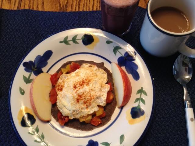 ++ 1½ two-oz eggs HINT: If you are serving one person, crack three 2-oz eggs into a small bowl or glass measuring cup. Whip up those eggs and pour half of their volume into a jar with a lid and put it in the ‘fridge for next week. ++++ 1 Tbsp truffle cream ++++ 3 oz melon OR 1¼ oz apple ++++ Optional: blackish coffee [53 calories] or blackish tea or mocha cafe au lait [65 calories] ++++ Optional: 5 oz fruit smoothie or berry-yogurt smoothie[88 calories] ++