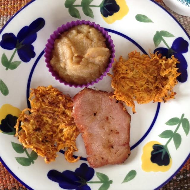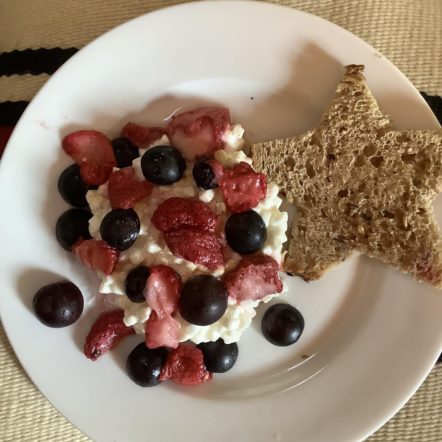 Cut your slice of bread with the star cookie cutter. TIP: freeze the scraps for use in Crab Cakes or Stuffed Clams or Crab-Stuffed Flounder cf. Sprinkle the bread with a small pinch of cinnamon sugar and toast it. Measure the ricotta onto your plate. Put the fruit on top. [Tip: Better not to stir the fruit into the cheese, since it will ‘stain’ the cheese.] Top with a small pinch of cinnamon sugar and plate with the toast. Pour the optional beverage. Huzzah!