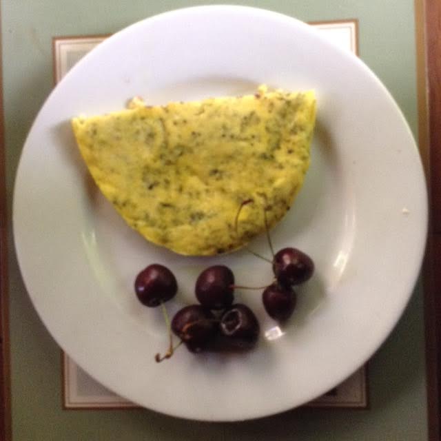 1 two-ounce egg + half of a 3” diameter thin slice of salami + ½ clove garlic, minced 2 Tbsp sheep sorrel or arugula, coarsely chopped + 1 Tbsp ricotta cheese ½ Tbsp Parmegiano-Reggiano cheese or pecorino cheese, grated + 5 cherries Optional: blackish coffee [53 calories] or blackish tea or mocha cafe au lait [65 calories] Optional: 5-6 oz fruit smoothie or berry-yogurt smoothie [88 calories]