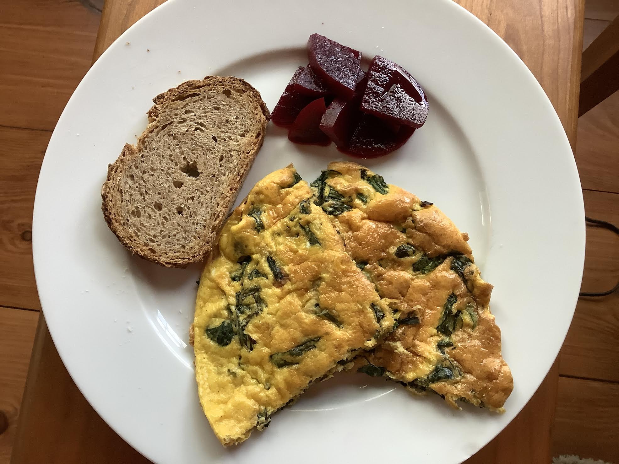 St Denis ScrOmelette: 144 calories 8 g fat 2 g fiber 12.5 g protein 6.4 g carbs 57 mg Calcium NB: Food values shown are for the ScrOmelette and fruit only, and do not include the optional beverages. PB GF James Beard’s comprehensive volume American Cooking gives us the recipe for this breakfast. Delicious, and rich, and wonderful. Worth getting up for.