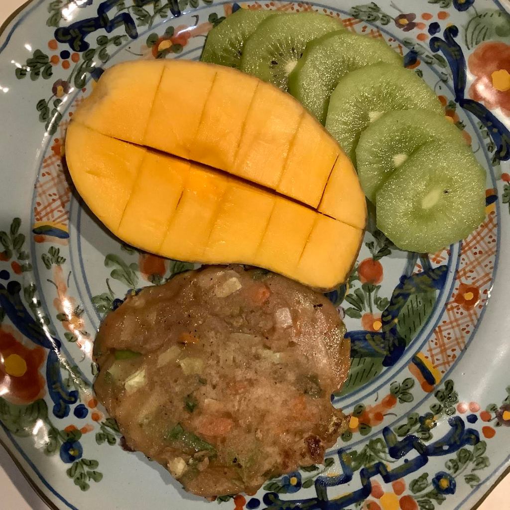 Rounds, with Egg: 175 calories… 8 g fat… 2 g fiber… 12 g protein… 20 g carbs… 38 mg Calcium… NB: The food values given above are for the egg bake and fruit only, not the optional beverages. PB GF Simple to prepare, easy to eat. Having a few pan muffins tucked into the freezer makes life easier. This breakfast will keep you rolling along through your morning: there is lots of protein and every element is ROUND.