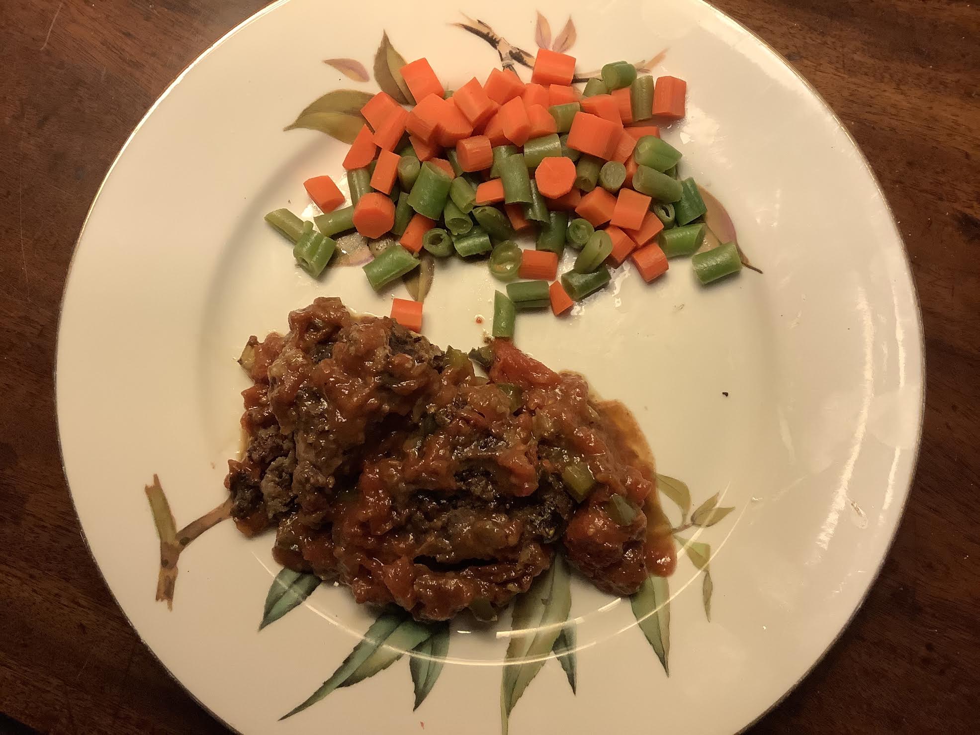 ++ ½ pound chuck steak, cut 1 to 1.5” thick ++++ 1.5 Tbsp white whole wheat flour ++++ salt + pepper ++++ 8 oz stewed tomatoes ++++ ¼ cup minced green bell peppers ++++ ¼ cup minced onion ++++ herbs to taste, such as rosemary or parsley ++++ per serving: ½ cup cut green beans ++++ ½ cup carrots sliced as coins ++