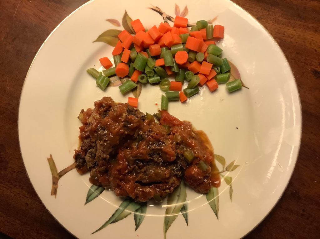 Swiss Steak: 267 calories… 6.5 g fat… 6.5 g fiber … 28 g protein… 27.5 g carbs … 105 mg Calcium… PB GF — if using GF flour This is a recipe from Fannie Farmer’s cookbookwhich I fondly remember from my childhood. HINT: This recipe makes enough for two [2], so save half of it for a future lunch or dinner.