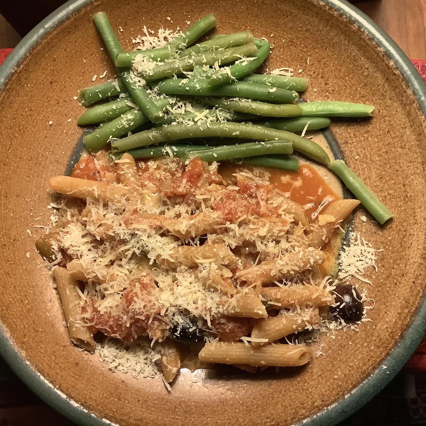 1½ oz whole wheat pasta ½ cup puttanesca sauce 2 Tbsp Parmesan cheese 2 oz green beans