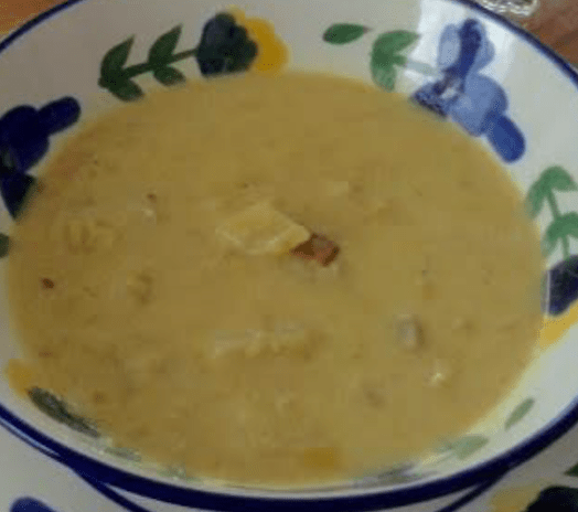 Put the dry peas in a bowl and add water to cover them by 2”. Let them sit and soften for 1.5 hours. Drain. TIP: you will not need the soaking water for the soup, but use it to water the houseplants. Put the peas, bacon, thyme, and water in a saucepan. Bring to a gentle boil, then turn down the heat, cover, and simmer for 1¼ hours. NB: Not all the liquid will be used up. That’s fine. Remove the bacon and the thyme stems. Using a food processor, blender, or immersion wand, puree the soup. There should be 6 cups. Soup should be loose enough to run off a spoon, but not too thin. Add water, if necessary, to adjust thickness. Taste for seasonings. Cook the bacon in a saute pan until it is crisp. Crumble it and add to the soup.