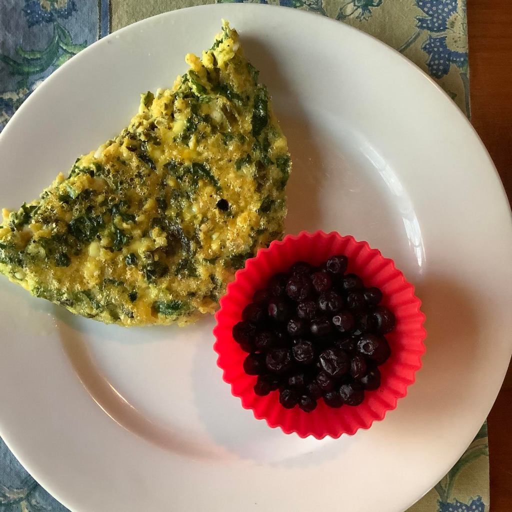 1½ two-oz eggs HINT: If you are serving one person, crack three 2-oz eggs into a small bowl or glass measuring cup. Whip up those eggs and pour half of their volume into a jar with a lid and put it in the ‘fridge for next week ½ oz Danish bleu cheese ½ oz herring marinated in wine 1 oz apple, sliced so you can see the star inside Optional: blackish coffee [53 calories] or blackish tea or mocha cafe au lait [65 calories] or lemon in hot water Optional: 5 oz fruit smoothie or berry-yogurt smoothie [88 calories]
