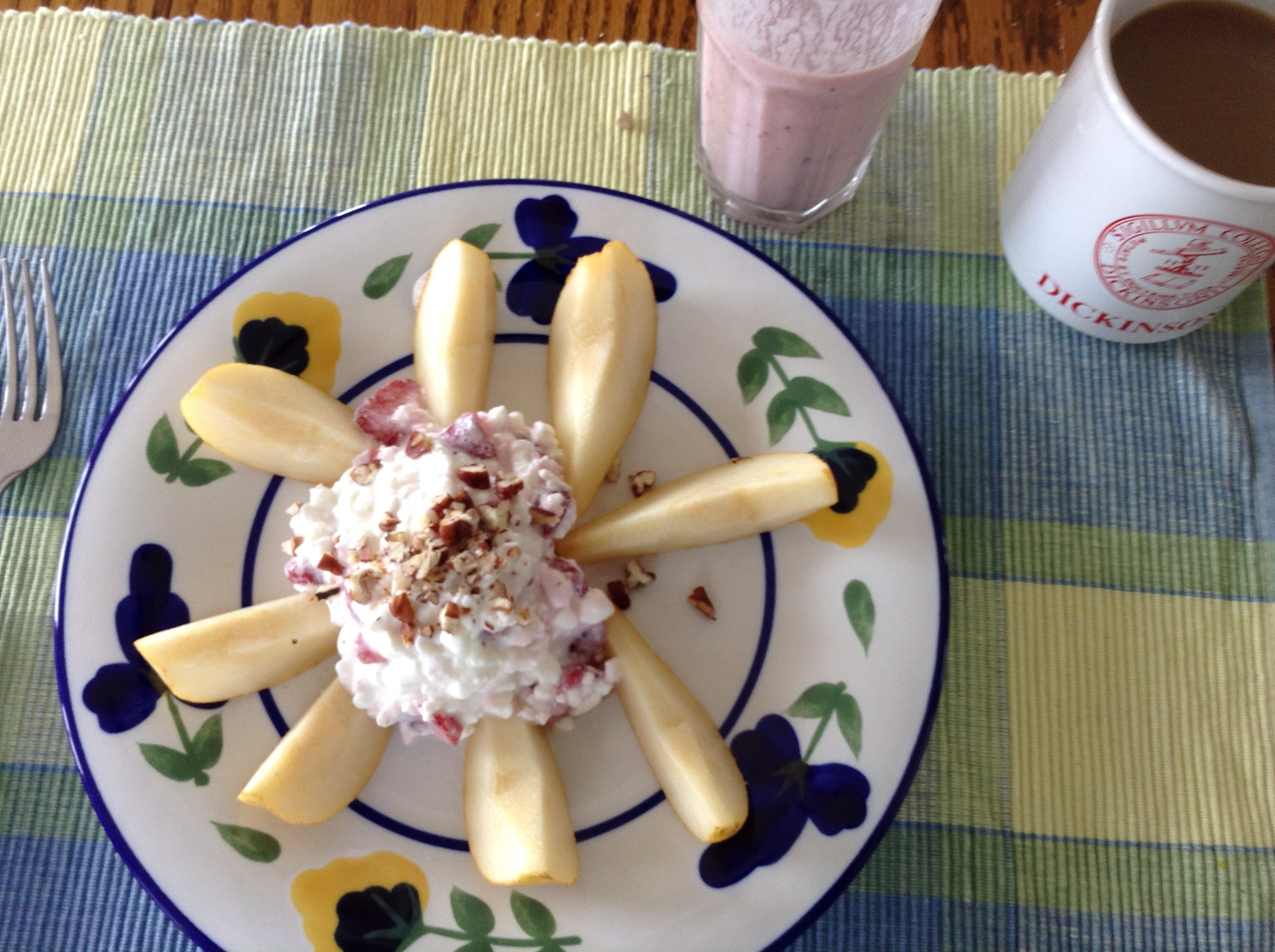 2 Libum [33-grams of dough each] 2 oz pear 1 deglet noor date 1 oz chicken breast meat Optional: blackish coffee [53 calories] or blackish tea or mocha cafe au lait [65 calories] or lemon in hot water