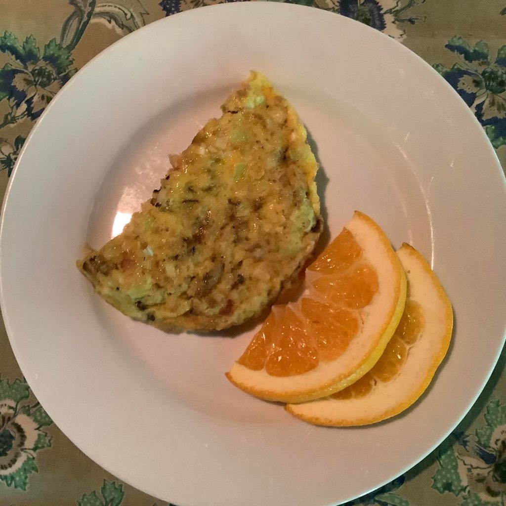 Ratatouille-Egg Galette: 151 calories 5.5 g fat 2 g fiber 9 g protein 14 g carbs 53 mg Calcium NB: The food values given above are for the egg bake and fruit only, not the optional beverages. PB GF – if using GF crepes Here the eggplants of Italy marry with the galettes of France. A perfect blend of cuisines.