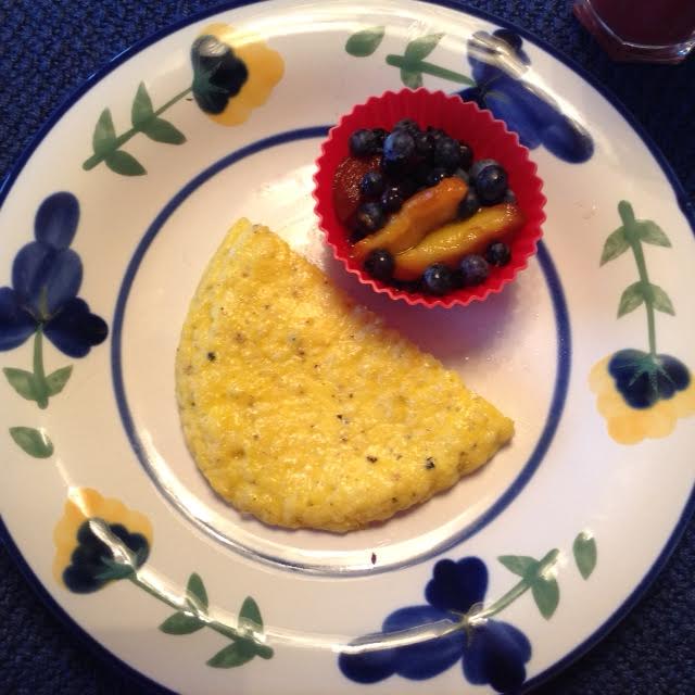 1 ½ two-oz eggs HINT: If you are serving one person, crack three 2-oz eggs into a small bowl or glass measuring cup. Whip up those eggs and pour half of their volume into a jar with a lid and put it in the ‘fridge for next week. 0.6 oz ground, cooked bison ½ Tbsp [0.1 oz] sliced scallion ½ Tbsp spaghetti sauce 1 oz melon Optional: blackish coffee [53 calories] or blackish tea or mocha cafe au lait [65 calories] or lemon in hot water Optional: 5 oz fruit smoothie or berry-yogurt smoothie [88 calories]