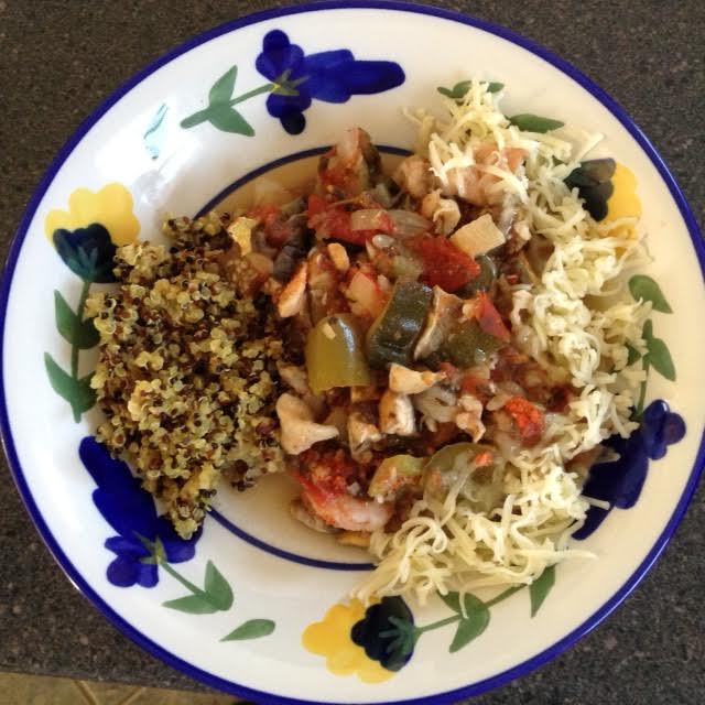 4 oz raw chicken breast 1.5 Tbsp lemon juice 2 tsp soy sauce 1 tsp olive oil 1 tsp fresh ginger, minced 1 clove garlic, crushed 1.5 cups cabbage, sliced 1 cup carrots, julienned ½ cup snow peas OR 2 oz asparagus OR 2 oz bell peppers OR 1 oz broccoli