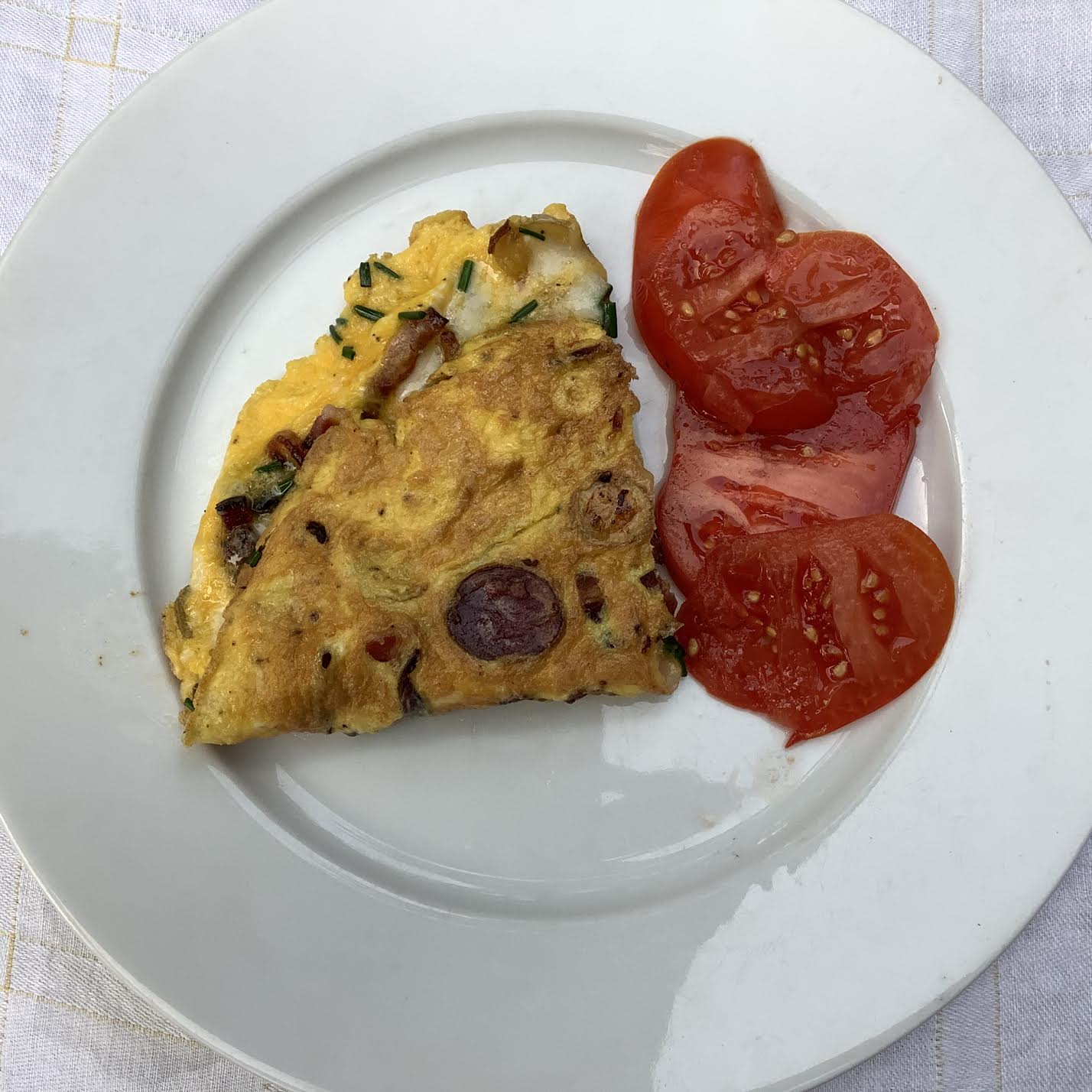 | 2.7 oz egg, unshelled–salt + pepper | 3 two-oz eggs = 5.4 oz unshelled–salt + pepper | Whisk eggs with salt + pepper. Pour over bacon + potatoes in pan. |