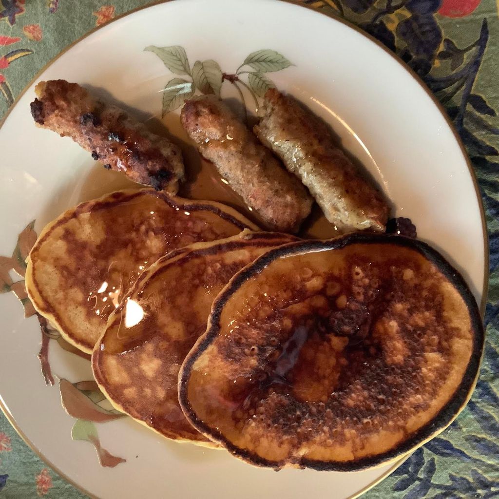 Serve warm, with blueberry syrup and chicken sausages.