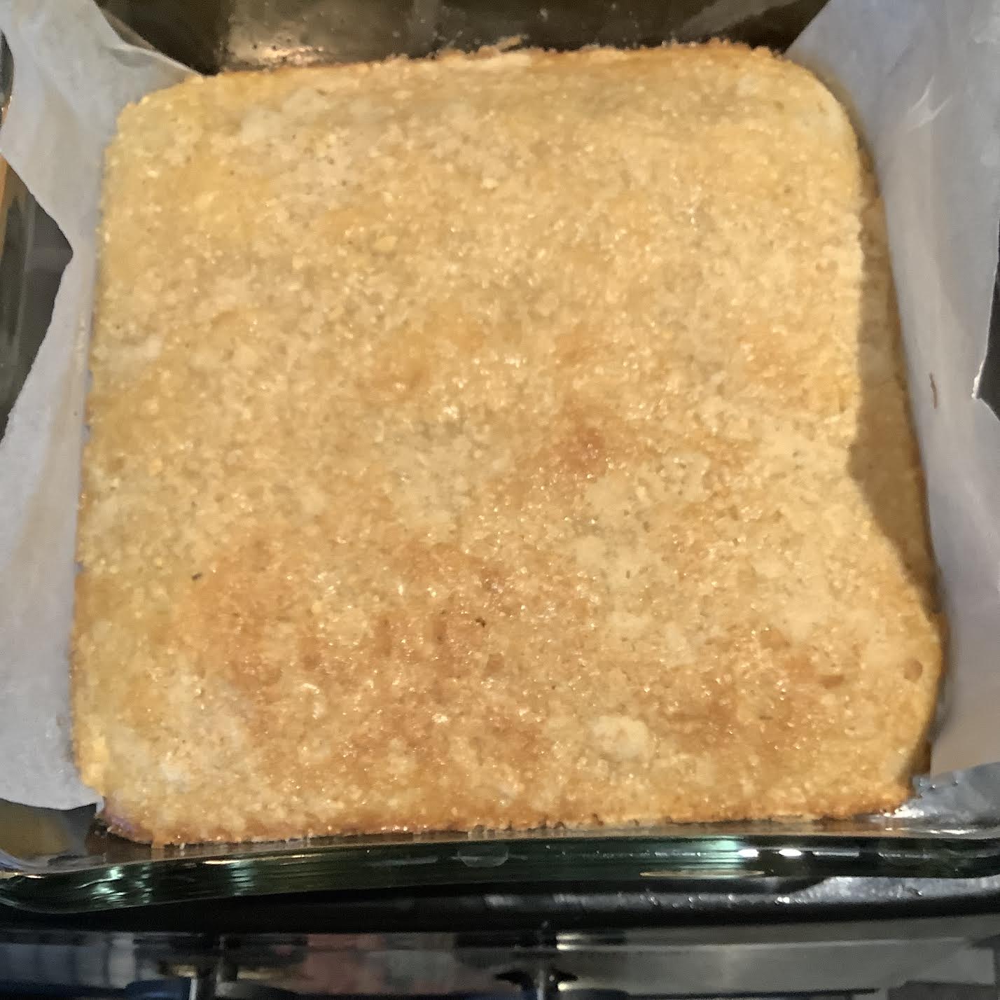 Fresh from the oven, in an 8×8″ pan. Cut into 9 pieces.Served with strawberry yogurt, back bacon, mocha cafe au lait, and orange-rhubarb juice.