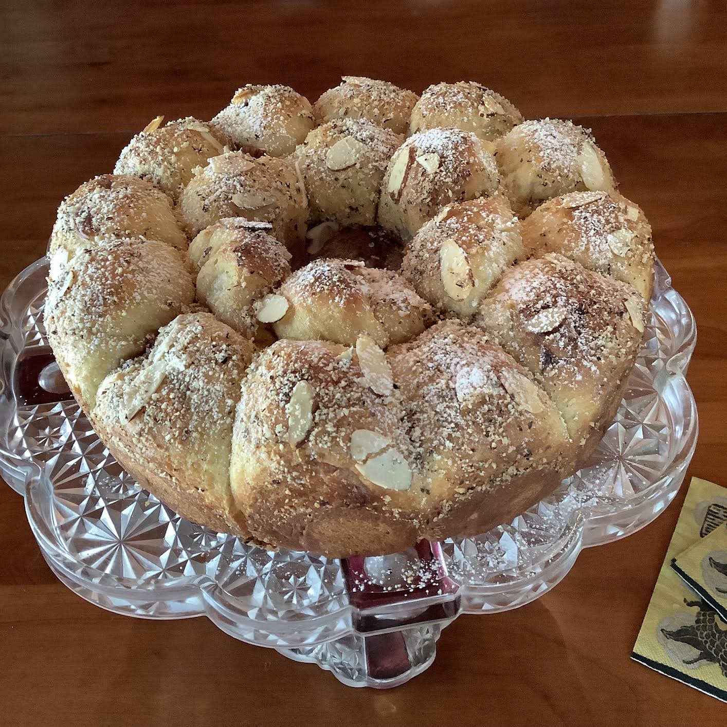 Butter a 10” tube pan. ORPut a greased ramekin in center of buttered 12″ pie plate. Put 6 balls, seam side down, around center tube. Put 12 balls in an outer circle. Cover, let sit 2 hrs until puffy –OR– OVERNight @ 40 degrees