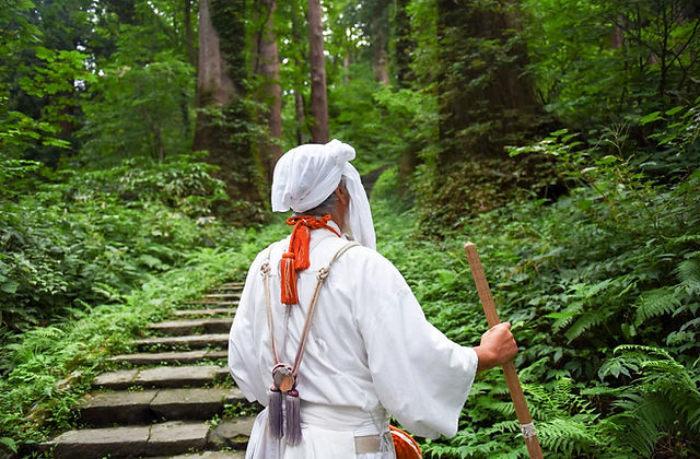 Do great mountains leave you with a sense of awe? You are not alone. In 7th century Japan, as recently-arrived Buddhism was mixing with the indigenous Shinto beliefs, there rose a synthesis of their ideas, further combined with Taoism. One origin story tells of Prince Hachiko (542–641 CE) who took refuge near Mount Dewa after his father was assassinated. Hachiko would often retreat high into the mountains where he learned herb lore and communed with nature. This experience gave him insight into the local peoples’ view that the mountains were the sacred dwelling place of dieties. After Hachiko spent 100 days of isolation in the mountains, he returned to the village to end a plague that had afflicted the people. His spirituality attracted pilgrims and disciples. Thus evolved the arduous training system for would-be practitioners, including climbing sheer cliffs, immersion in freezing water, and adopting a life of extreme asceticism — by “suffering on behalf of others” they take the pain and struggles of ordinary people on themselves. Only after years of training can one be a full-fledged ‘Yamabushi’ [meaning: one who lays himself down in the mountains]. Magical powers were ascribed to the Yamabushi, and the religion spread across Japan’s mountains. Shrines were built on mountain-tops — there are no temples — and 88 sacred sites were established for pilgrims to visit. The religion was banned in 1872, as Japan tried to modernize itself. When freedom of religion was established after, WW2, interest in Shugendo revived. Today, there are full-time Yamabushi, and part-timers — people from all walks of life who go to the mountains for spiritual purity and to get in touch with nature for a 3-day experience. They wear white, symbolizing the death of their old life, and are decked with traditional tokens of the sect. A trip to the Dewa Sanzan has become a way to honor the ancient ways and to escape from the pace of modern life. And the Yamabushi lead them.