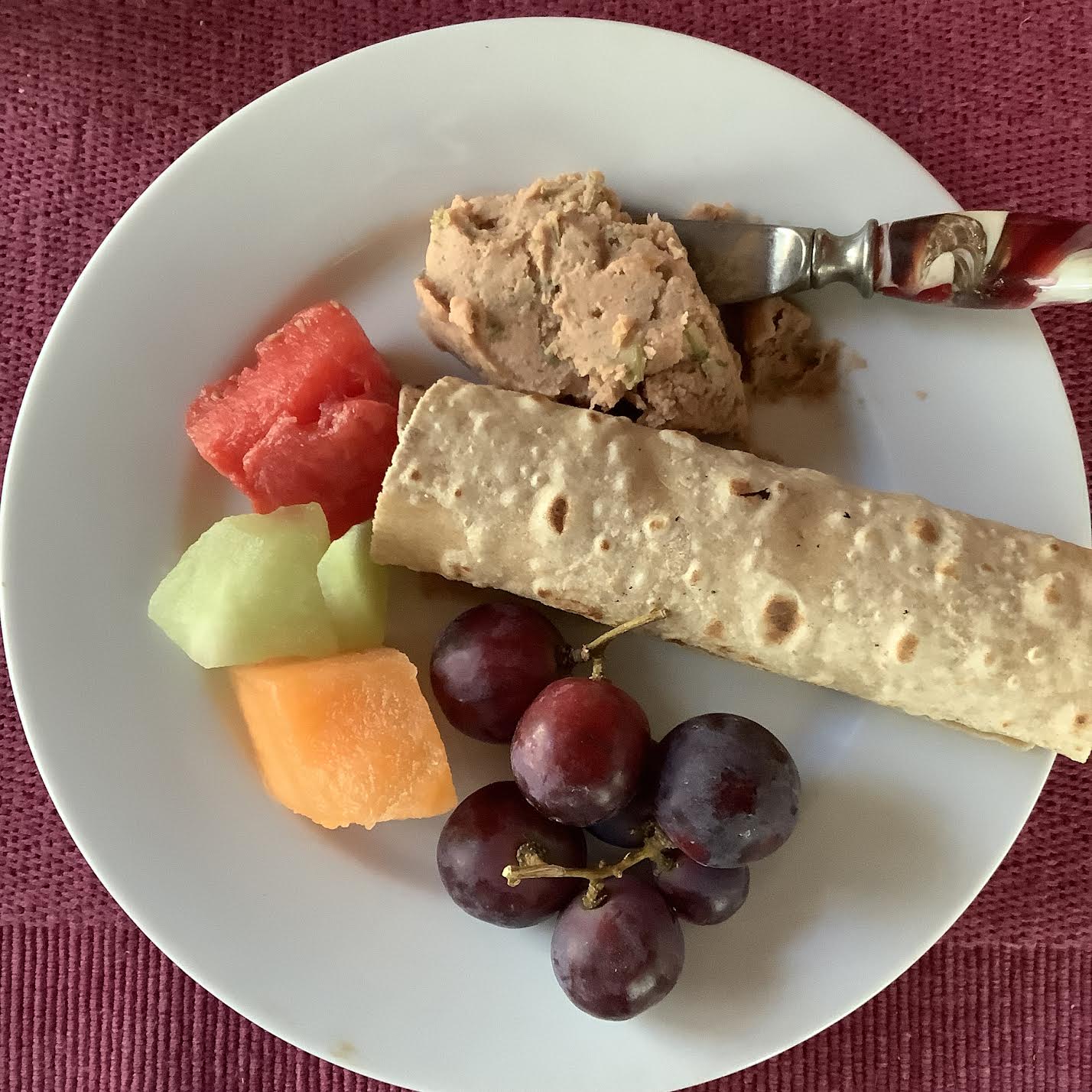 if your beverage is water: ++ ¼ c hummus +++ 1 oz whole-grain unleavened lavash bread ++++ 3 oz melon ++++ 3 oz grapes +++++ if saving room for mocha cafe au lait: ++ ¼ c hummus ++++ 1 oz whole-grain unleavened lavash bread ++++ 3 oz melon ++++ 2 oz grapes ++