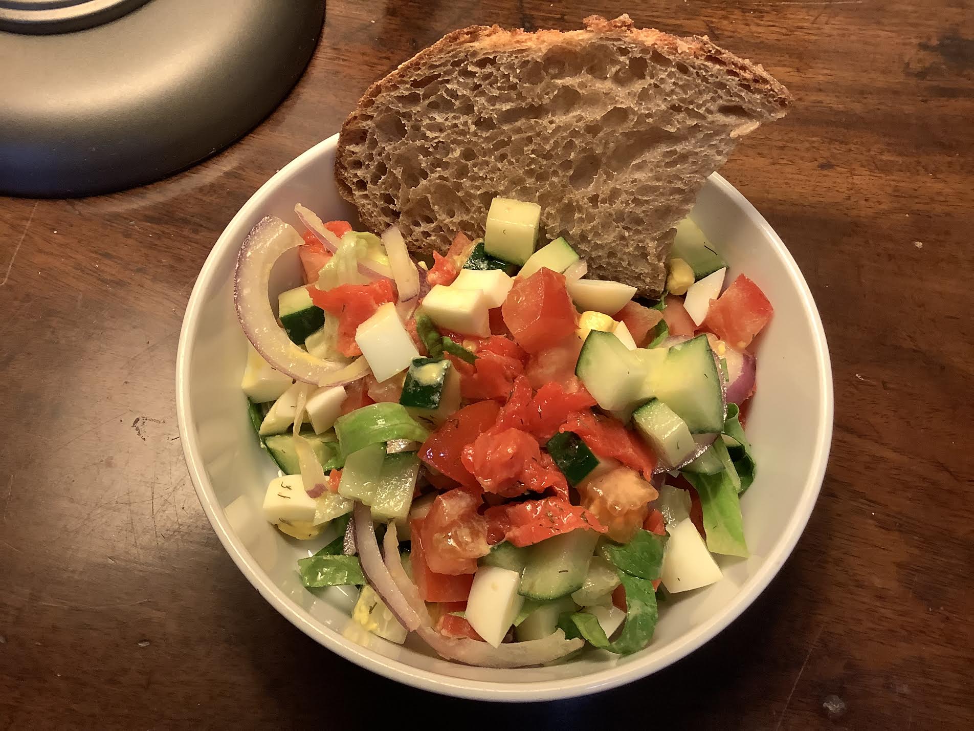 | 2½ oz/½ cup sweet pepper —— 3 oz/½ cup tomato, diced —— 2”/ ½ cup cucumber, diced——2 oz/½ c small onion —— 1 Tbsp fresh cilantro leaves—–3 anchovy fillets——6 cured black olives—– | Seed peppers and chop finely. Cut tomatoes into ½” dice. Dice or thinly slice cucumber. Slice onion thinly. Chop cilantro and anchocy fillets. Pit olives and cut in half or chop. |