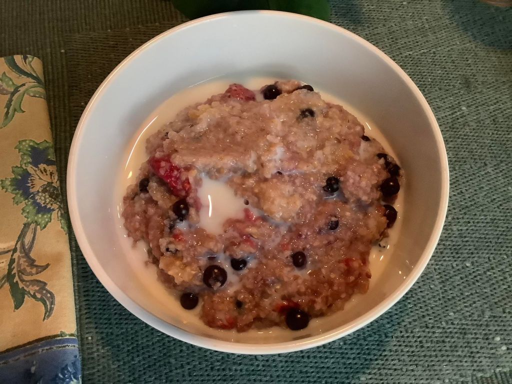 +++++4 Tbsp [63 g] part-skim ricotta ++++ 4 Tbsp [63 g] 2%-fat cottage cheese ++++ 1 egg, separated +++++ 30 g /3.5 Tbsp white whole wheat flour OR almond flour ++++ ½ tsp sugar ++++ 3/4 oz banana, sliced +++++ 1 tsp molasses ++++ 1 tsp water ++++ Optional: blackish coffee [53 calories] or blackish tea or mocha cafe au lait [65 calories]