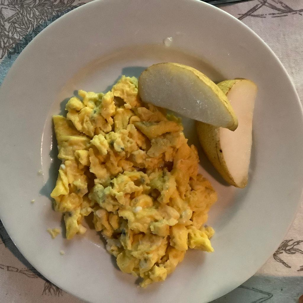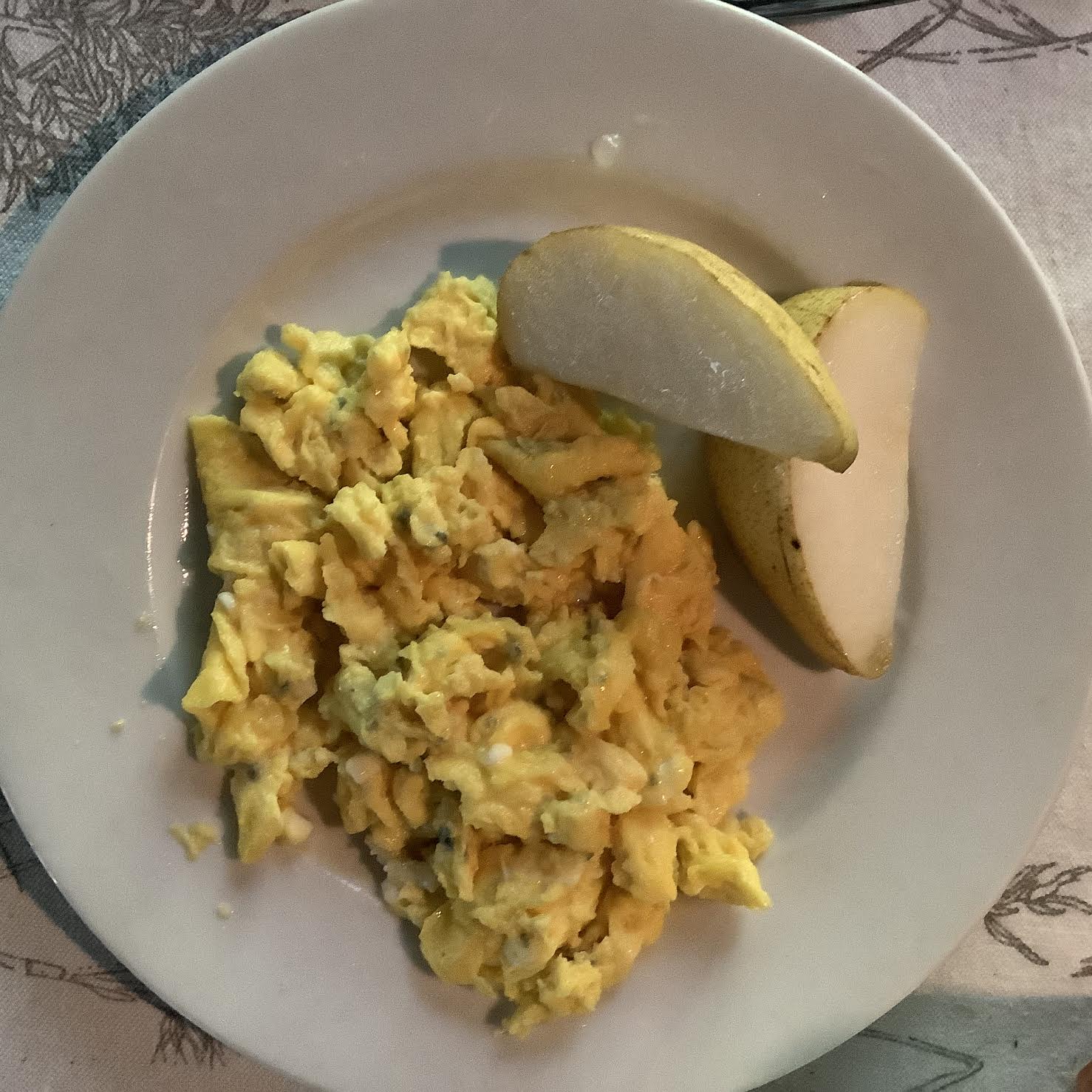 1½ two-oz eggs HINT: If you are serving one person, crack three 2-oz eggs into a small bowl or glass measuring cup. Whip up those eggs and pour half of their volume into a jar with a lid and put it in the ‘fridge for next week. 3/8 oz bleu cheese 1 Tbsp fat-free cottage cheese 3 oz applesauce, unsweetened Optional: blackish coffee [53 calories] or blackish tea or mocha cafe au lait [65 calories] or lemon in hot water Optional: 3 oz fruit smoothie or berry-yogurt smoothie [44 calories]
