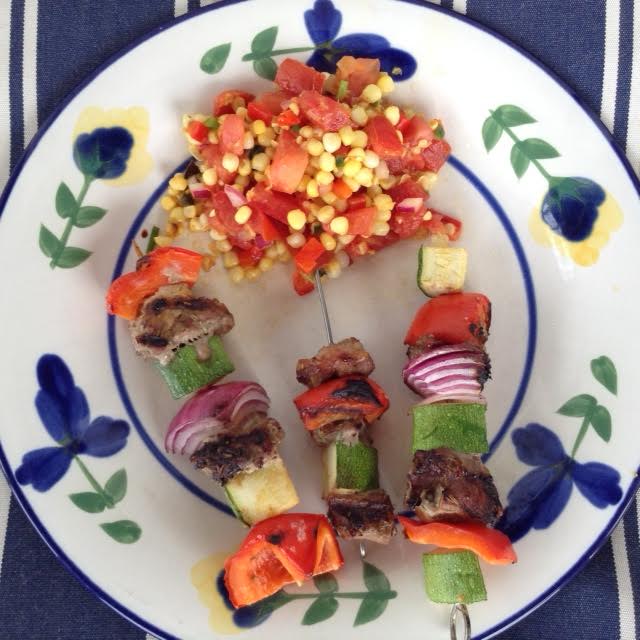 Combine the tomato juice, garlic, and rosemary with the lamb. Stir to coat and set aside to marinate for 30-60 minutes. Prepare the vegetables and Corn Salsa while the meat sits. Impale the vegetables and lamb chunks on skewers, then sprinkle with salt and pepper. Heat a grill pan [indoors] or an outdoor grill and cook the kabobs on all sides. The meat will brown and the vegetables will begin to char a bit. Plate with the salsa for a very colorful meal.